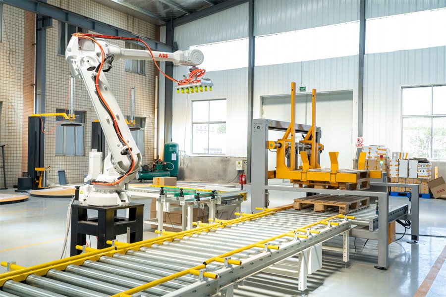 日化產(chǎn)品機(jī)器人碼垛線是由自動(dòng)定位抓取系統(tǒng)、ABB機(jī)器人系統(tǒng)、供棧系統(tǒng)、自動(dòng)覆頂膜纏繞系統(tǒng)、自動(dòng)輸送系統(tǒng)組合而成。該線體前段為日化瓶裝產(chǎn)品的自動(dòng)罐裝、開封箱等組成,后端接駁機(jī)器人碼垛線形成自動(dòng)化生產(chǎn)流水線。