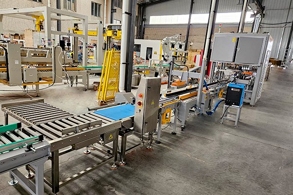桶裝箱是裝箱案例中非常典型的的產(chǎn)品,針對(duì)不同桶的類型以及瓶口直徑的大小、效率的不同,裝箱機(jī)都會(huì)有所變化。該套機(jī)油桶裝箱包裝線是由高速熱熔膠開箱機(jī)、平移式裝箱機(jī)、熱熔膠封箱機(jī)、自動(dòng)稱重剔除機(jī)組合而成。