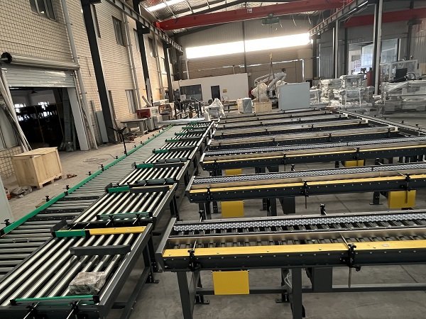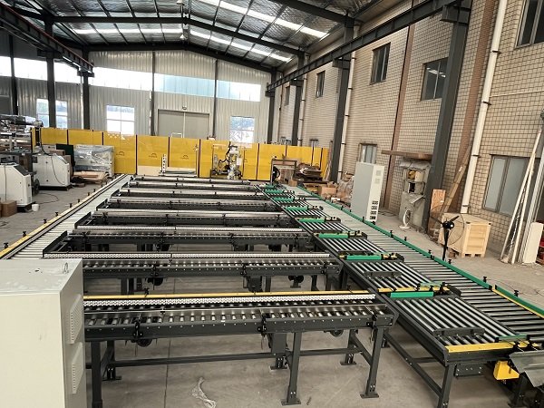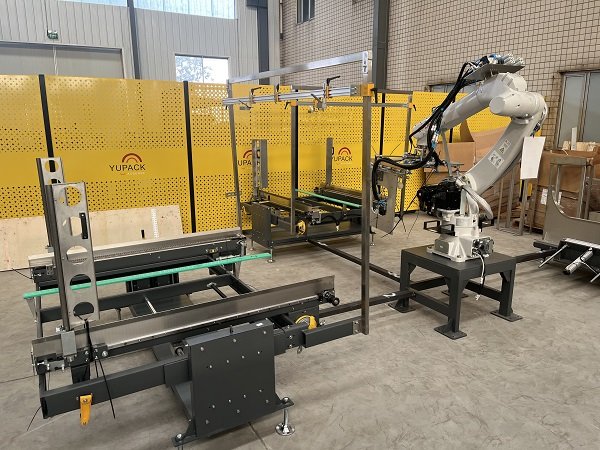 該線體主要功能是對卡丁車和賽車輪胎進(jìn)行裝箱和碼垛。線體最大亮點(diǎn)是,客戶一共有8條產(chǎn)線4種紙箱尺寸同時(shí)混產(chǎn),針對客戶的現(xiàn)實(shí)情況,艾訊采用了機(jī)器人+動力料倉+自適應(yīng)折底封底機(jī)的結(jié)構(gòu),通過信號交互,來確定取哪款紙箱,開哪款紙箱,再通過信號識別,將紙箱輸送到指定的裝箱工位。同時(shí)該線體還配備了實(shí)時(shí)貼標(biāo)加在線打印功能,通過和上位機(jī)的實(shí)時(shí)通訊,來確定紙箱需要打印的標(biāo)簽內(nèi)容。