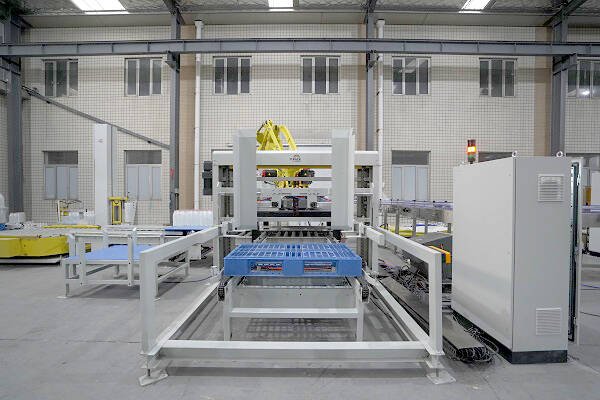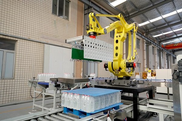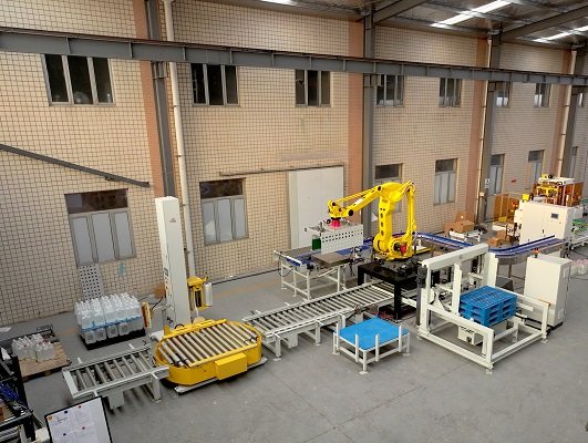 膜包水碼垛纏繞包裝線是由供棧機、理料線、碼垛機器人、墊板倉以及在線纏繞機等設(shè)備組成。該線體常用于礦泉水、飲料、啤酒、瓶裝調(diào)味料等產(chǎn)品碼垛使用。鑒于前端罐裝產(chǎn)品的效率比較高,碼垛機器人采用庫卡大負載機器人,同時配以復(fù)合式抓手,即可實現(xiàn)一列產(chǎn)品一起抓取,也可以同時抓取墊板,占地面積小,成本低。