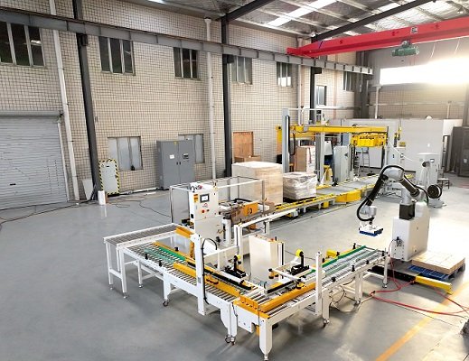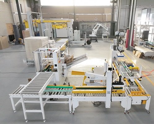 玉米面條十字封箱機是由開箱機、折蓋封箱機、90度轉向機構、半自動一字封箱機以及協(xié)作機器人碼垛機組成,該線體根據用戶現(xiàn)場比較緊湊的實際情況而設計,開箱機出料口高度較高,在成品紙箱上面,成品紙箱輸送機2側坐人進行裝箱,抬手即可拿取空紙箱,大大減少了設備的占地面積,同時方便用戶的實際操作。尾端配備協(xié)作機器人碼垛機,占地面積小,成本低,雙抓設計,工作效率高,特別適用食品類小紙箱的開封箱碼垛包裝。