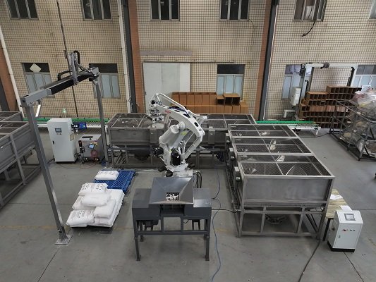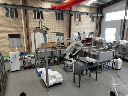 袋子卸垛是目前包裝領(lǐng)域非常常見的一種需求方式,用戶需要對托盤上的袋子進(jìn)行卸垛,同時(shí)需要將卸下來的袋子進(jìn)行破包,將內(nèi)部物料倒入提前準(zhǔn)備好的料斗里,有可能只有一種物料,有時(shí)也有可能是多種物料按照一定的比例混入料斗中,之后分別輸送到指定位置。而破袋后的袋子,有的需要緩存到其他的料箱中,而有的則需要直接粉碎后,再次回收。