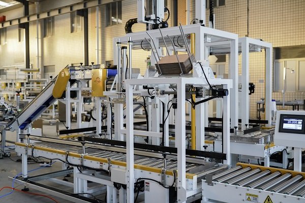 玉米種子包裝線是一條比較典型的自動(dòng)化包裝線體,該線體是由熱熔膠開(kāi)箱機(jī)、自動(dòng)裝箱機(jī)、熱熔膠封箱機(jī)、稱重剔除機(jī)、貼標(biāo)機(jī)以及動(dòng)力輸送機(jī)組成。同時(shí)該機(jī)還應(yīng)客戶要求,在裝箱工位增加了自動(dòng)放置墊板工序,使得整條線體的包裝流程更加智能更加流暢。
